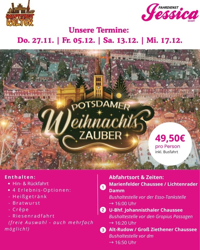 Im historischen Herzen Potsdams lädt der Weihnachtsmarkt-Zauber mit rund 250 Ständen, Bühnen, Karussells und abwechslungsreichen Attraktionen zu einer unvergesslichen Vorweihnachtszeit voller Genuss, Begegnungen und festlicher Stimmung ein.